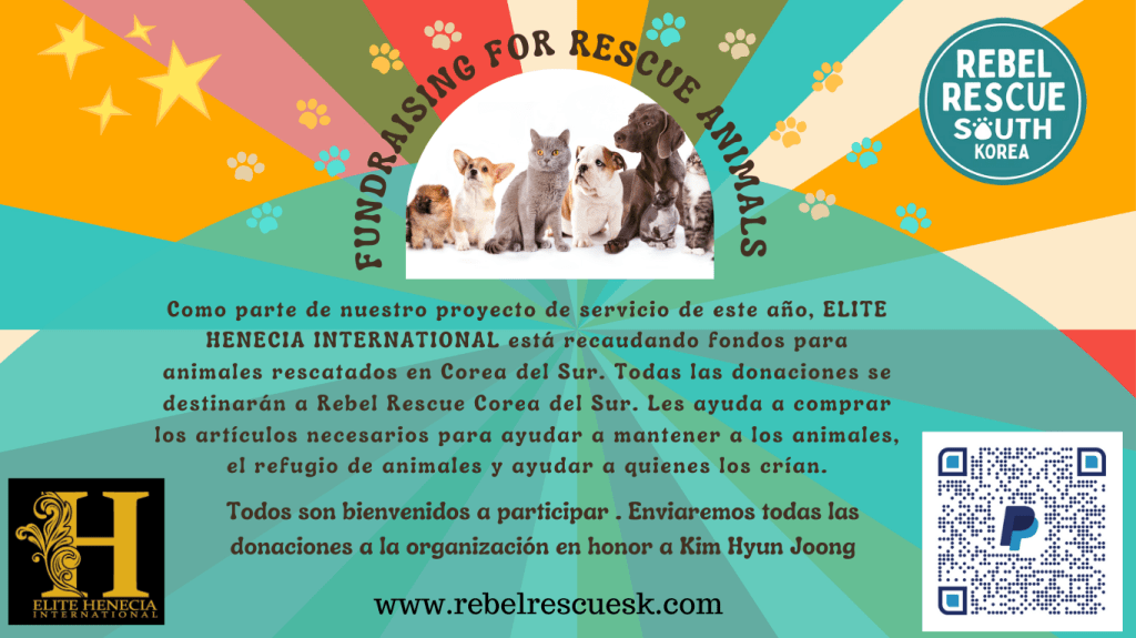 As part of our service project this year, ELITE HENECIA INTERNATIONAL, is Fundraising for rescue animals in South Korean. All donations will go to Rebel Rescue South Korea. It helps them buy the necessary items they need to help maintain the animals, the animal shelter and aid those who foster the animals.