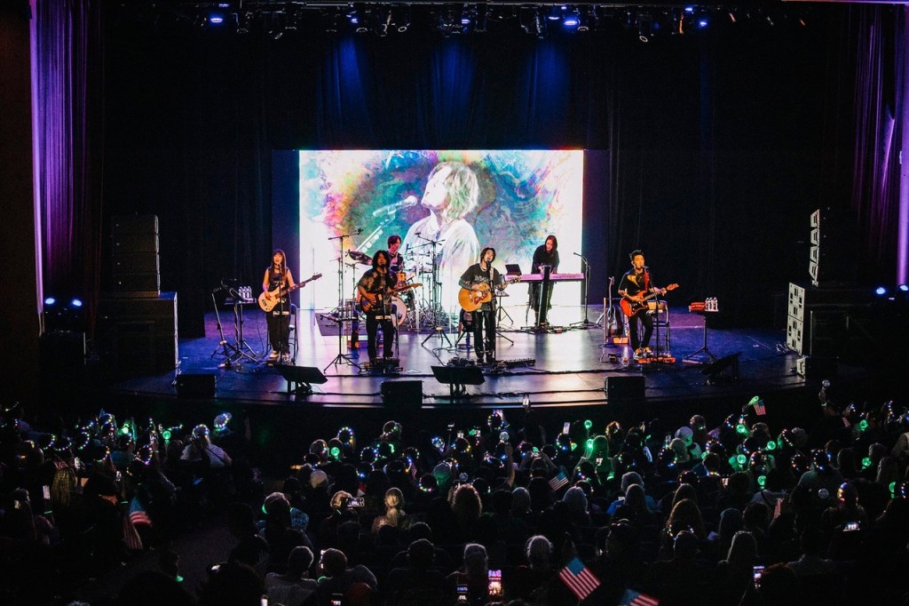 Already it felt good, like coming to a party where you already have friends. We hugged like old friends and knew we were about to share a very unique night. My daughter found us inside the venue and we made our way to our seats in the second row, our hands full of goodie bags, posters, and souvenirs and our hearts full of excitement and anticipation. The stage was ready with the End of the Dream sign lighting the area in a purple glow and the instruments waiting patiently for the band to come on