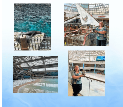 The first thing we saw was a seal swimming inside the mall. Surprisingly, there is a pirate boat inside the Mall. Let me show you some more things to do there. There is a wave pool with very big slides. There is also a skating rink. I would like to know how to play hockey.